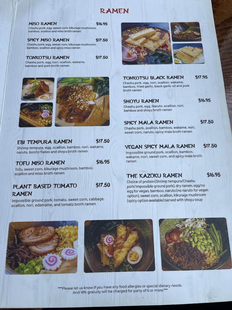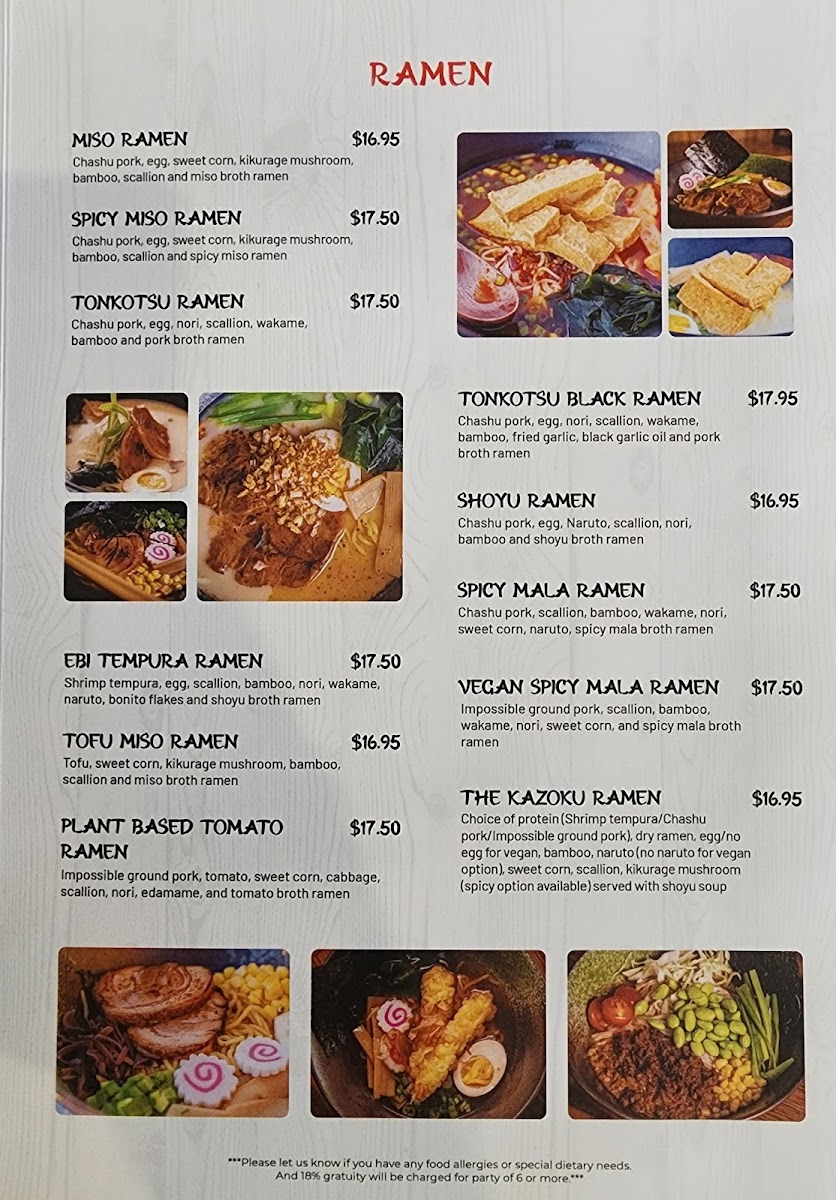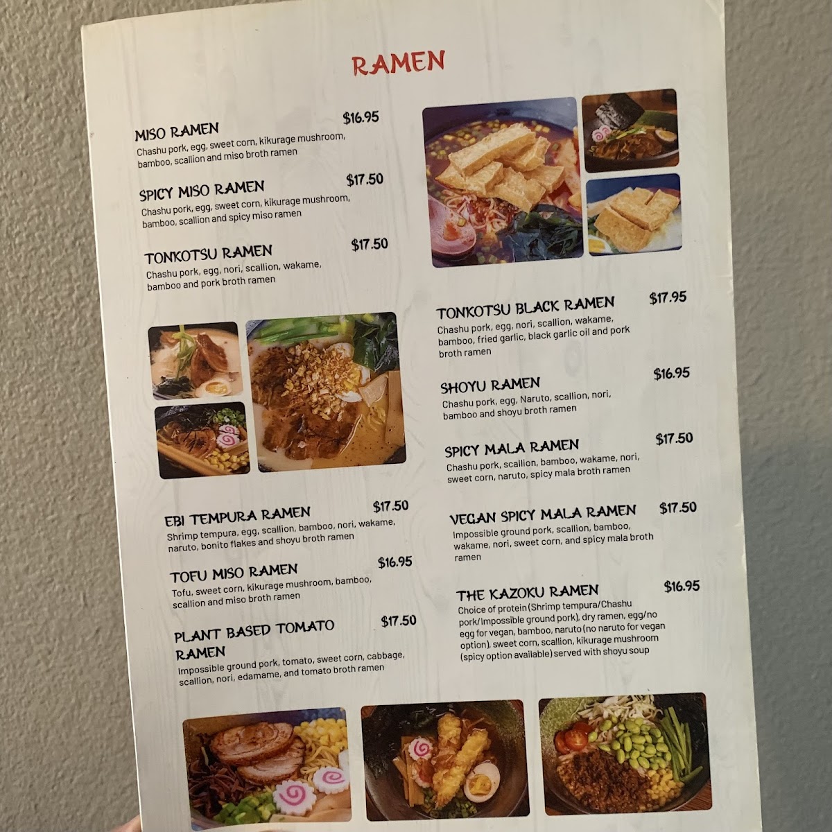 The restaurant also ensures that guests with dietary restrictions can enjoy their meal, providing a solid selection of vegan options and a welcoming space for families. Whether you're craving comfort food like Tempura Udon for $12.99 or a lighter, healthy choice like the Vegetable Sushi Roll at $8.99, there's something for every member of the family at The Kazoku.